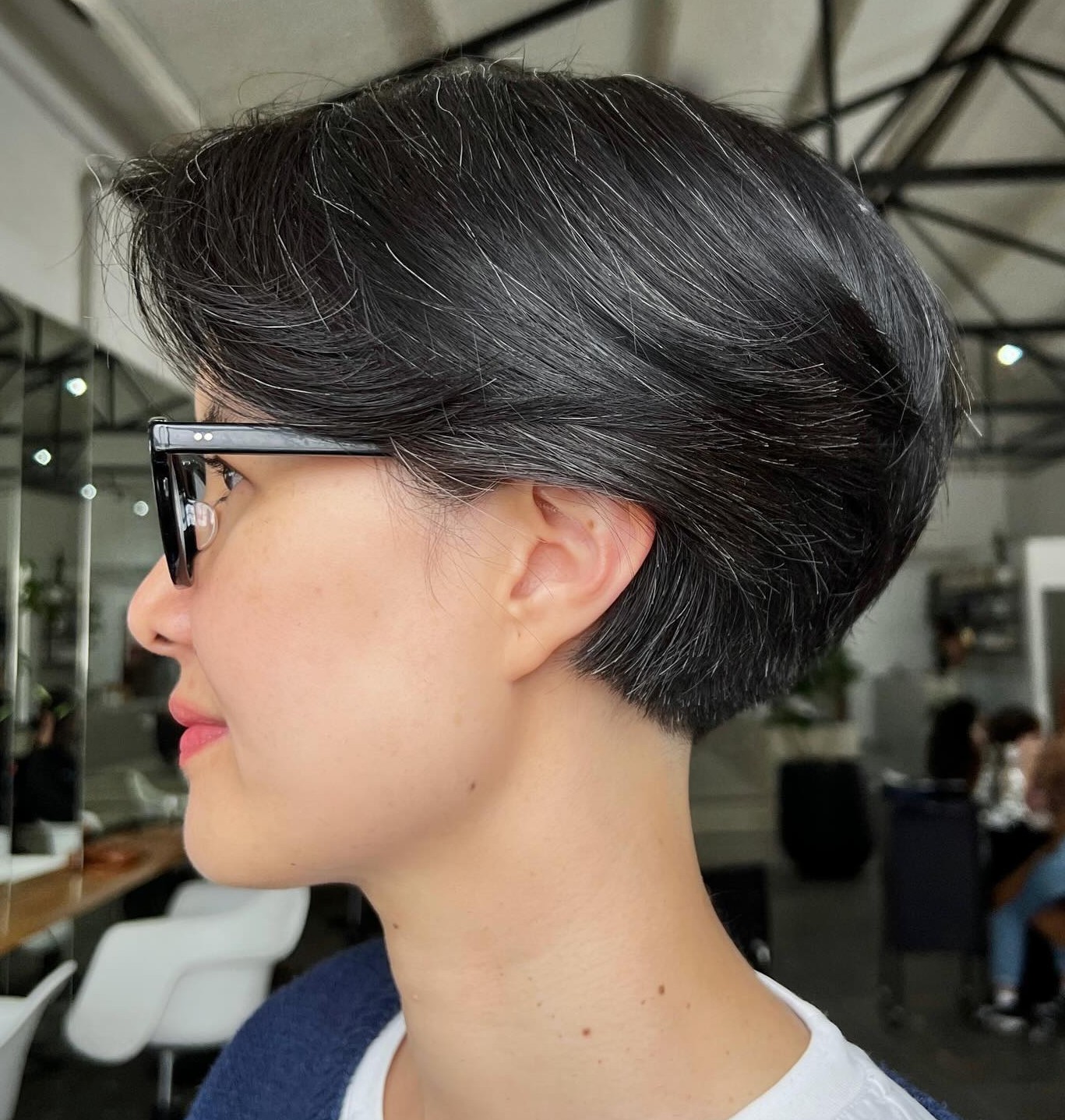 It might not look like your usual short layered style, and that’s exactly what makes it so special. The stacked layers throughout the crown and the soft sweeping bangs give such a laid-back flair. Perfect for women with long faces who need a stylish, low-maintenance hairdo.