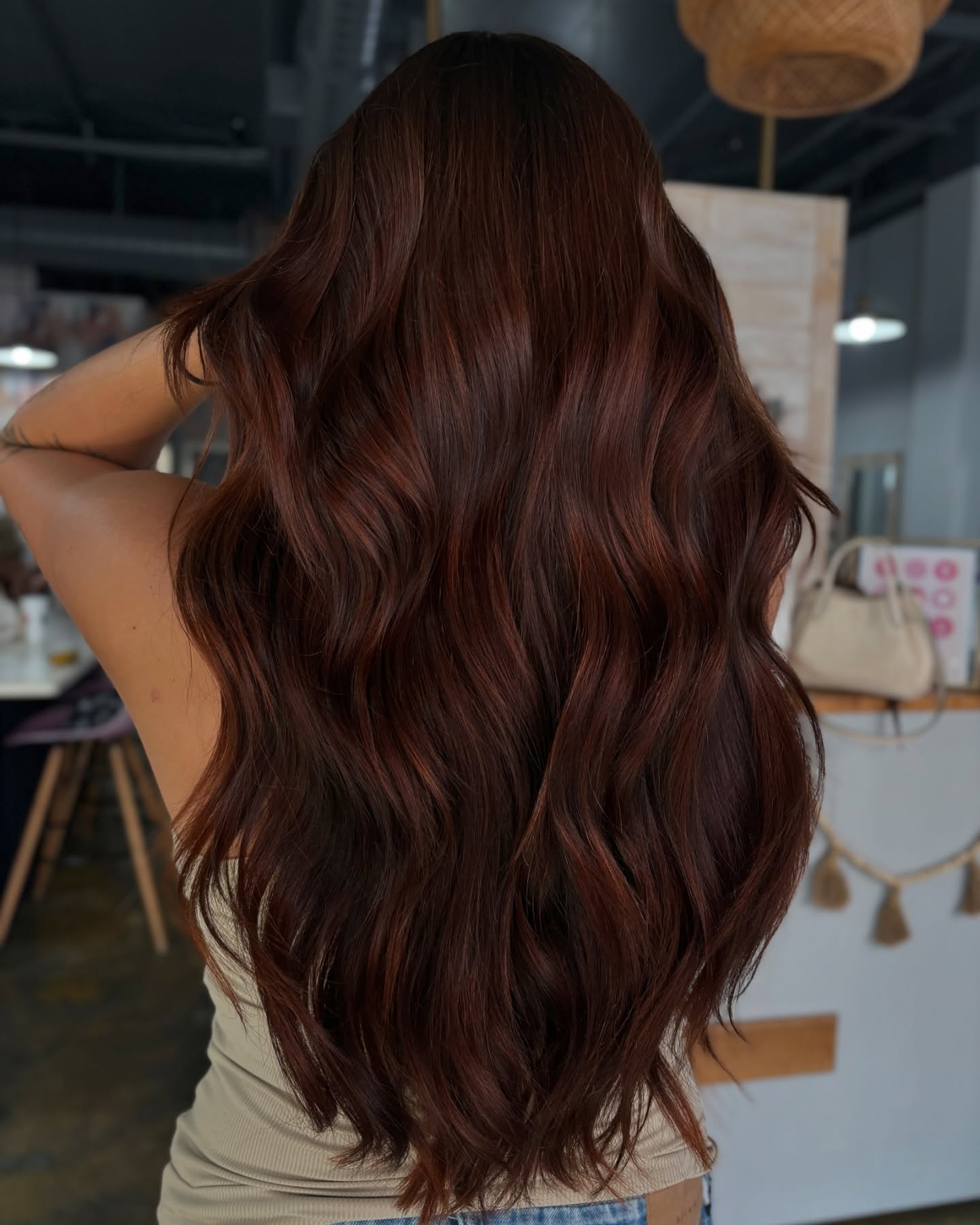 This mahogany red color is bold, intense, and simply adorable on brunettes. Keep your length, allowing the natural waves to cascade down the back. This is an all-over dye process, and so worth it!