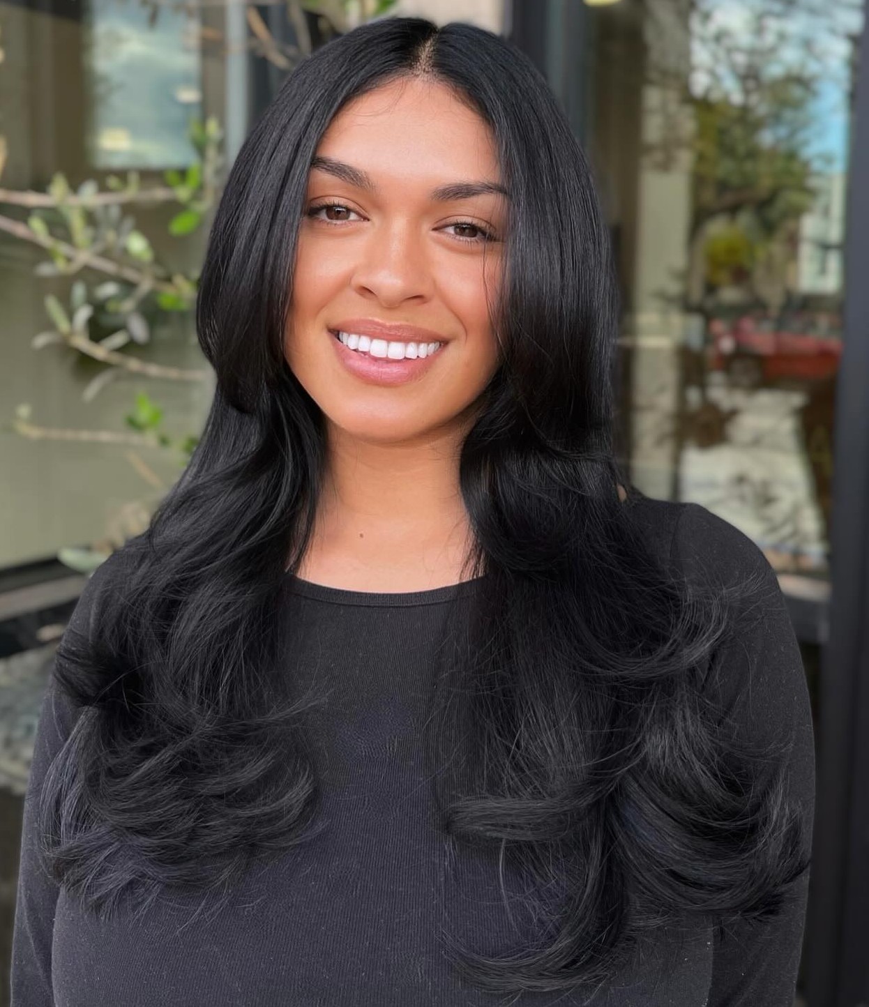 This is a fun look to try! Lavender makes a lovely color combo with super dark roots, but keep in mind that dark hair should be lightened in several stages to pull off the hue while preserving health. With a shiny finish, your flowing waves will look like pure silk! You will love the way your length shows off the hue.