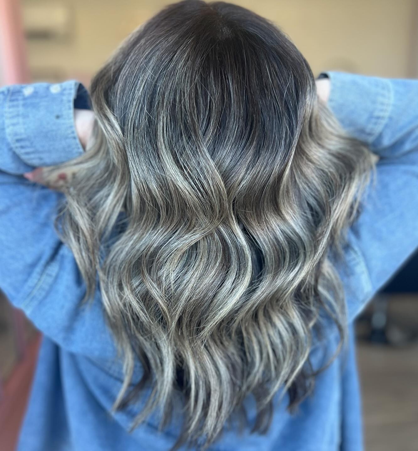 When searching for winter hair colors, remember, a smart blending of gray is a trendy option! It’s a bit longer process to get sophisticated hair color like this, but if you’re willing to sit, you can have this amazing look and make root touch-ups much less frequent! For a dramatic look, keep your length and style with voluminous waves.