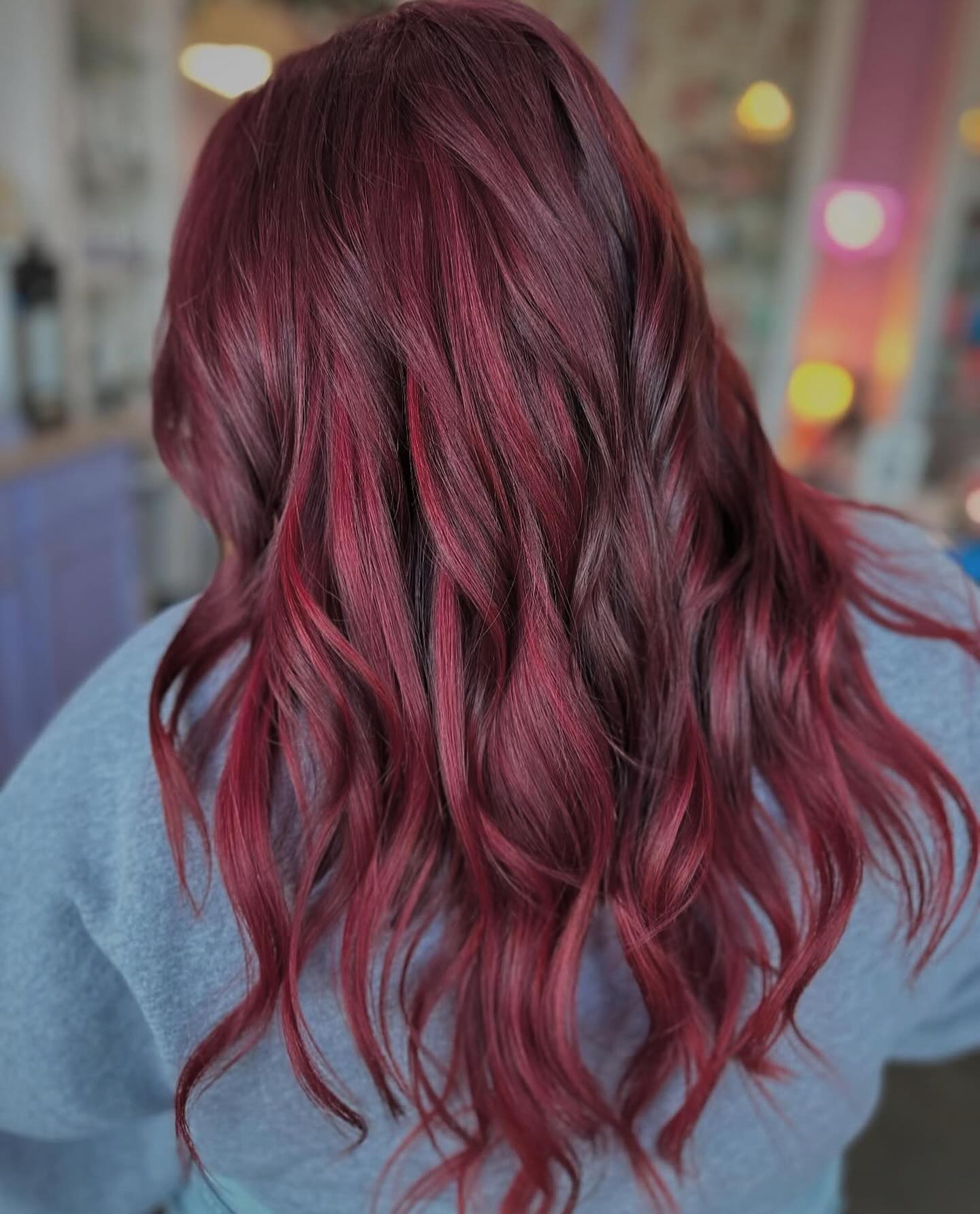 This burgundy hair whispers chic and good taste and requires many pictures to capture how awesome it looks. One of the best vivid yet deep winter hair colors out there!