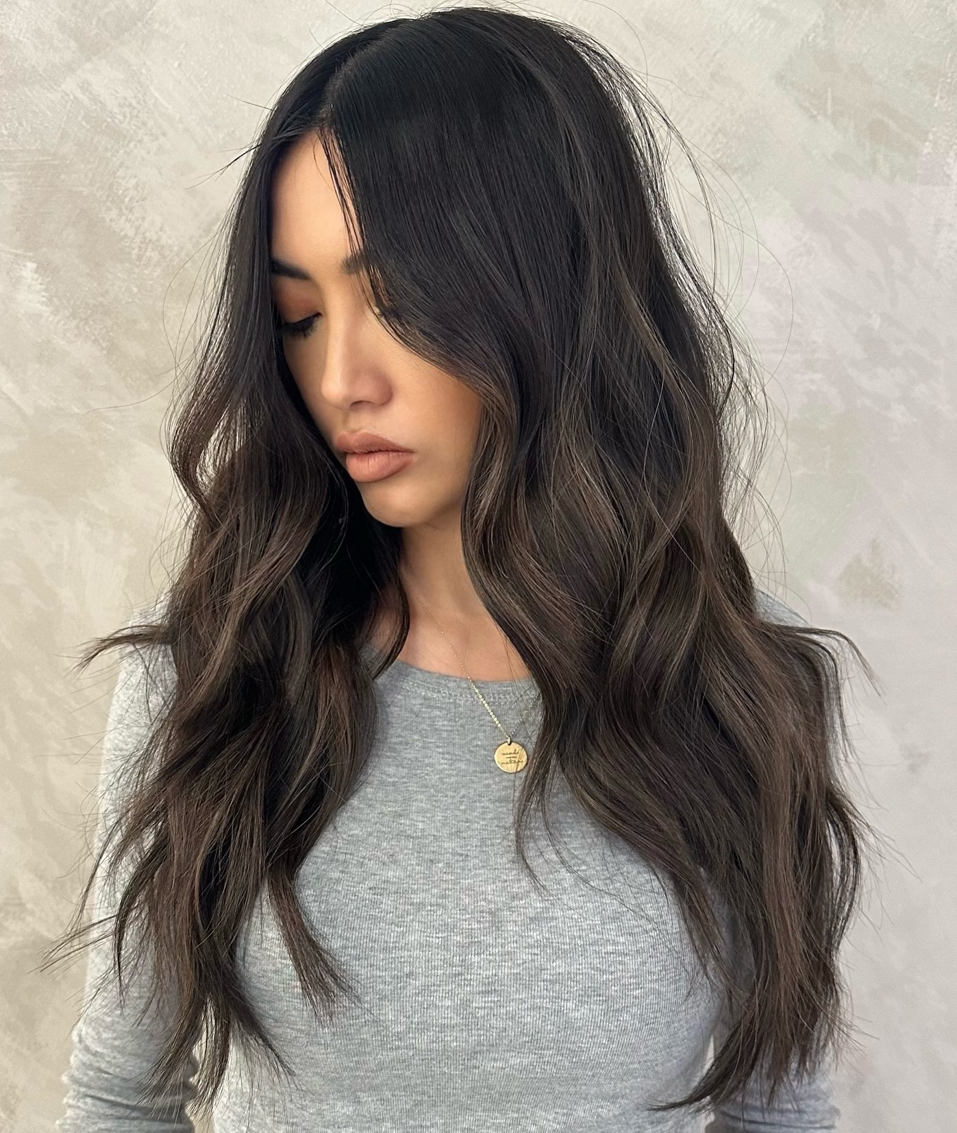 Black is a welcome color in winter seasonal color trends, but the solid hue is likely to look too gloomy. The black diluted with cool brown and thin blonde highlights is another matter. This is a do-not-miss brunette idea for sure!