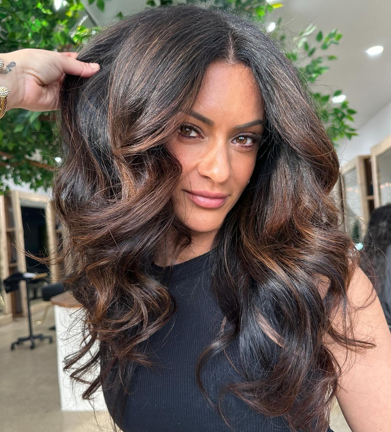 2025 is a great time to try out a new look, and if you’re not ready to go too bold, try this rich chocolate brown! The chocolate brown color accented with lighter chestnut tones makes these curls stand out for sure!