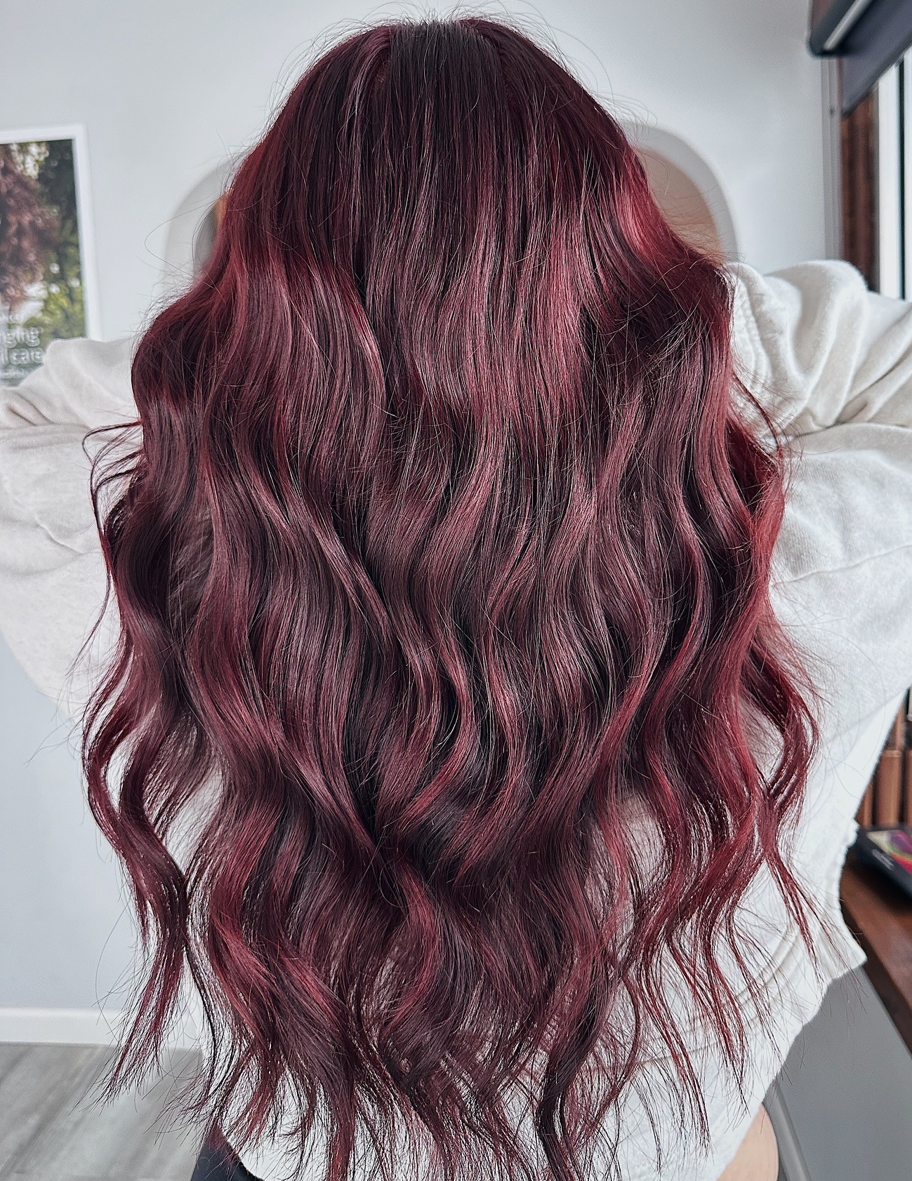 This mahogany red color is bold, intense, and simply adorable on brunettes. Keep your length, allowing the natural waves to cascade down the back. This is an all-over dye process, and so worth it!