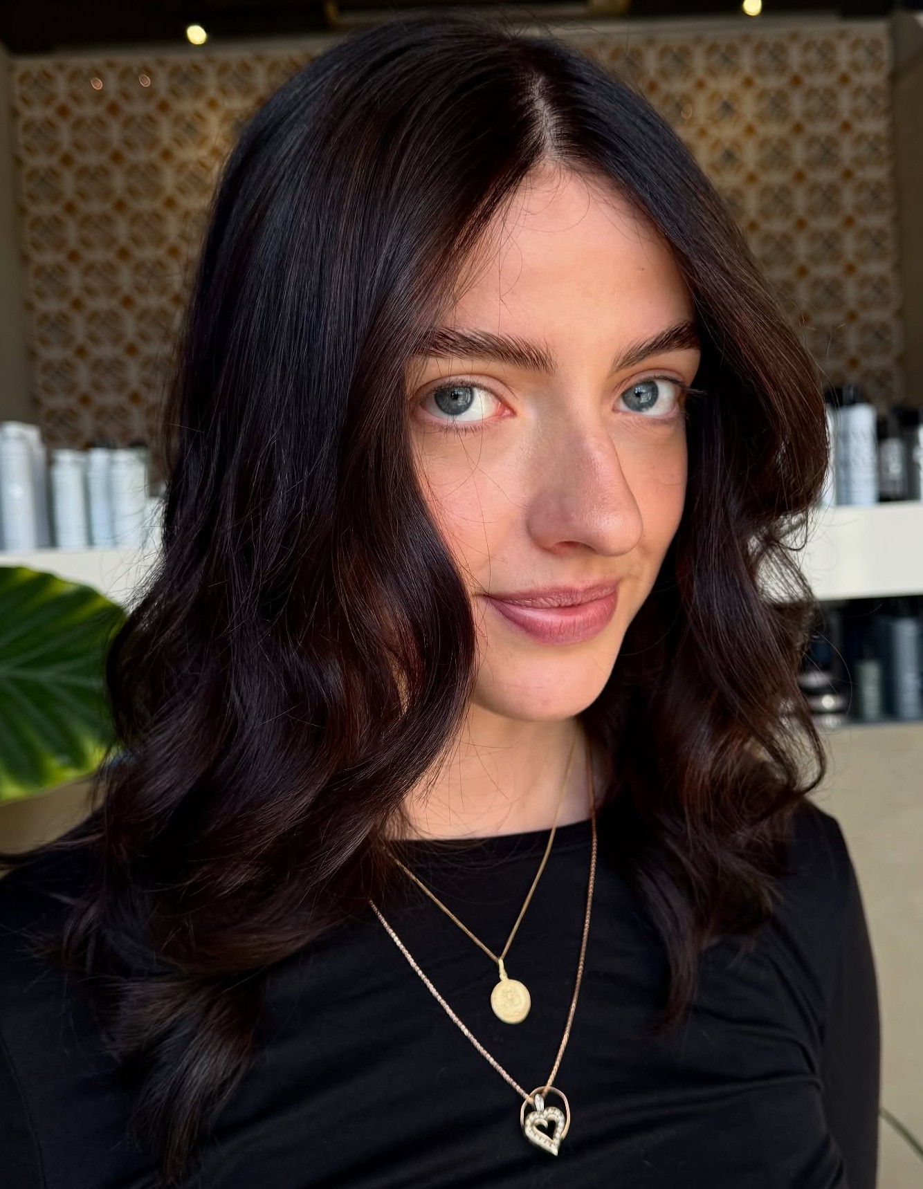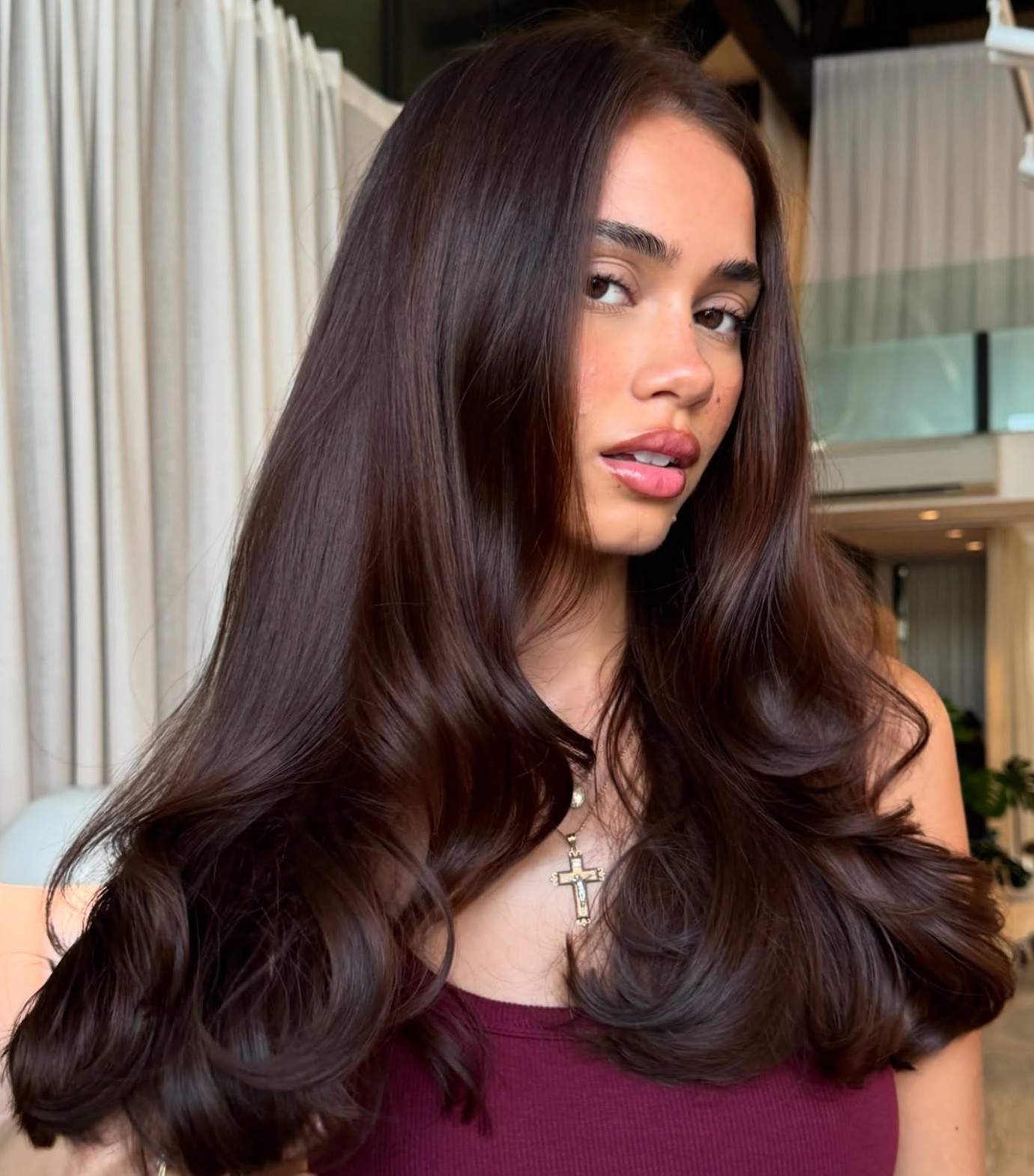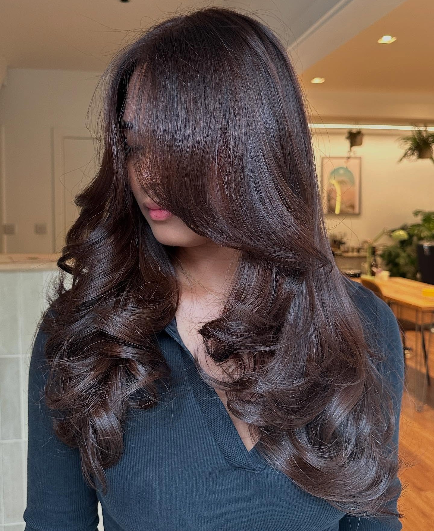 2025 is a great time to try out a new look, and if you’re not ready to go too bold, try this rich chocolate brown! The chocolate brown color accented with lighter chestnut tones makes these curls stand out for sure!
