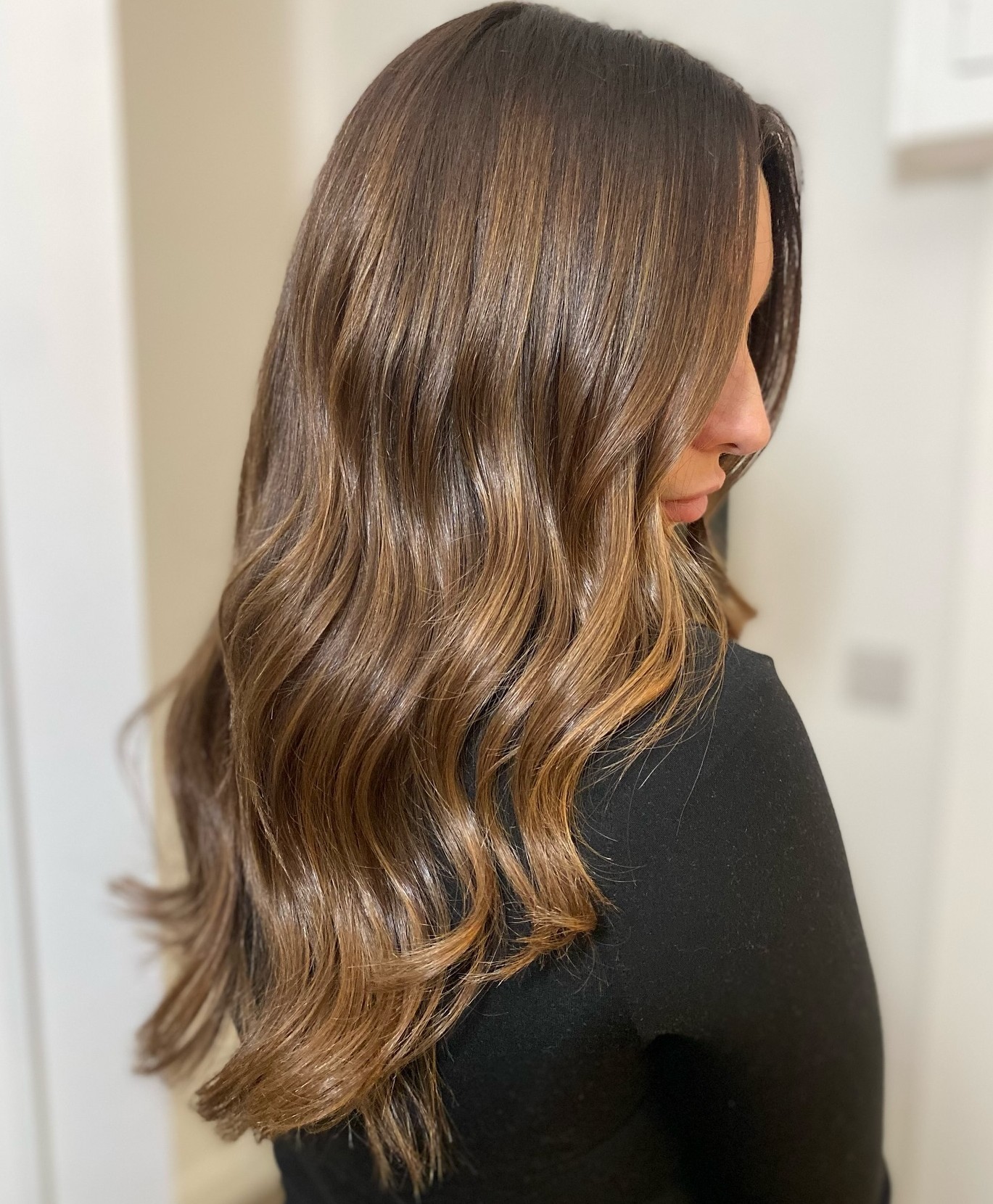 One of the softest looks we have chosen to showcase in this collection of winter hair colors is this caramel-glazed style with highlights. Two shades of brown are combined, enhancing your hair layers and creating amazing depth for your long mane.