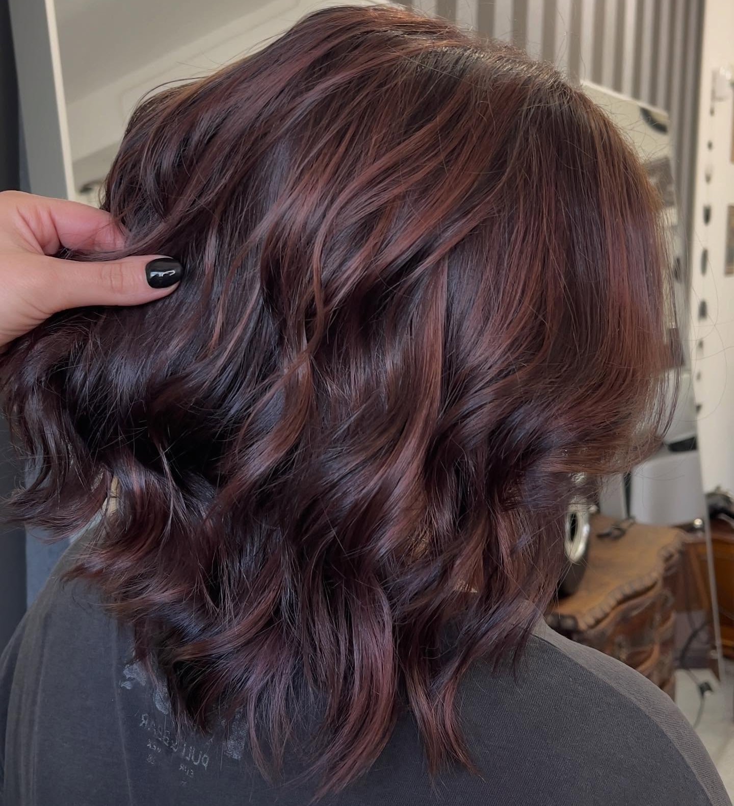 This mahogany red color is bold, intense, and simply adorable on brunettes. Keep your length, allowing the natural waves to cascade down the back. This is an all-over dye process, and so worth it!