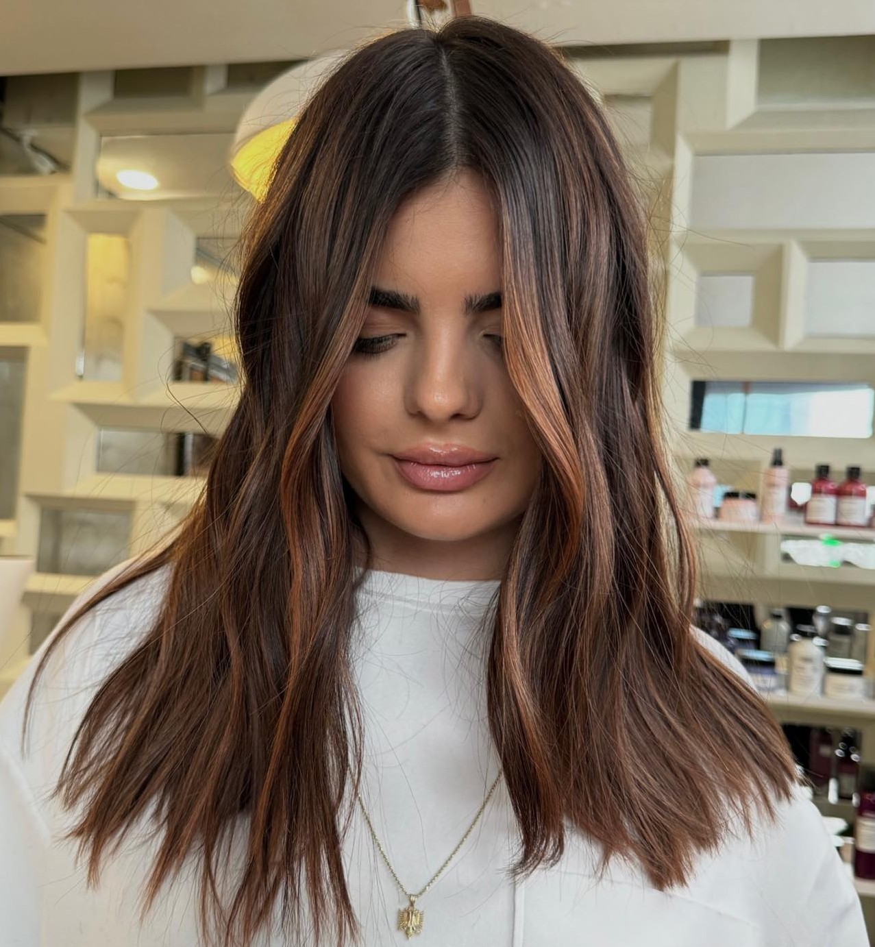 Rich and warm, a chestnut shade of brown hair has golden or red undertones in it. The root shadow and subtle face-framing highlights make this dimensional look the one to fall in love with this winter season!